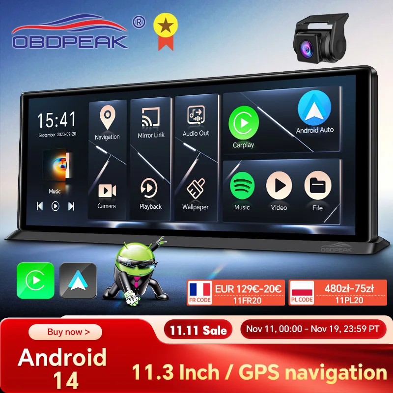 K60 Pro 11.3" 4G+64G WIFI Android 14 AI Screen GPS Navigation Carplay Android AUTO 1080P Dash Cam R…