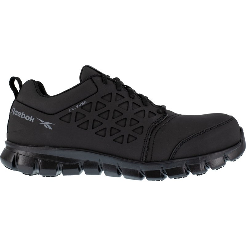 Step onto the job site ready for the day when you lace up the Reebok Men's ExoFuse Sublite Cushion Composite Toe EH Rated Work Shoes. The EXOFUSE water resistant microfiber uppers supply soft, comfortable wear, and boast XTR® brand composite toe caps for safety on the job. The MemoryTech Massage 2.0 Memory Foam insoles deliver plush, adaptive comfort and are complemented with Sublite EVA Cushion midsoles for a lightweight, flexible fit and feel, while the EH rated SR Tread Rubber outsoles with slip resistant protection ensure durable traction on slick surfaces. Reebok Men's ExoFuse Sublite Cushion Composite Toe EH Rated Work Shoes Black, 10 - Lace St Work Boots at Academy Sports