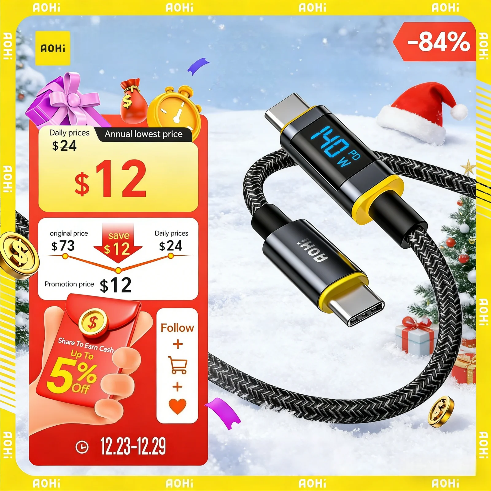 AOHI Magline+140W Nylon USB C to USB C LED Digital Display Cable 4ft