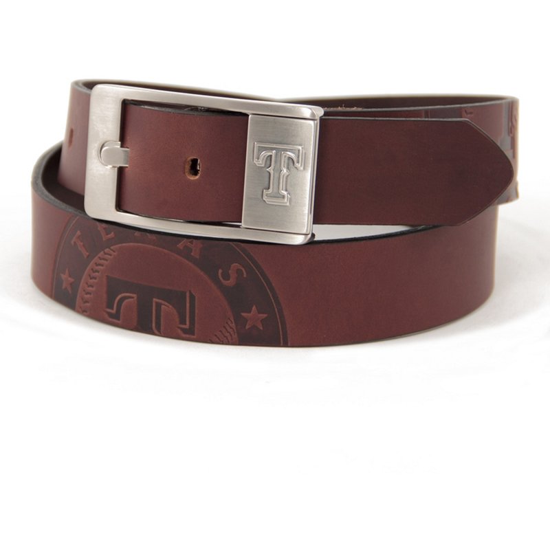 Elevate your favorite outfit with an Eagles Wings Texas Rangers Brandish Leather Belt. Genuine leather and a polished metal buckle lend lasting durability and a classic look that matches any look. Bold graphics celebrate your favorite team. Eagles Wings Texas Rangers Brandish Leather Belt Brown, 32" - Pro Licensed Novelty at Academy Sports