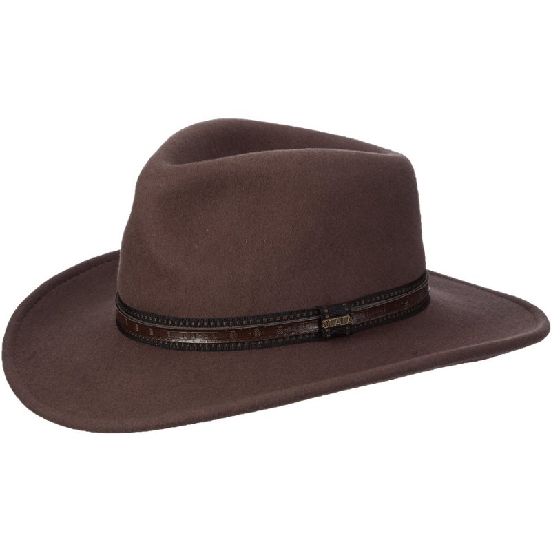 Stay comfortable and stylish in the heat when you wear the Scala Men's San Antonio Scala Outback Wool Hat. The wool felt construction offers a soft feel and features a water repellent finish to help keep you dry. The ribbon band and leather overlay add style to your look, while the 3-inch brim provides custom sun protection and cooling shade. Scala Men's San Antonio Scala Outback Wool Hat Beige, Medium - Men's Hunting/Fishing Headwear at Academy Sports