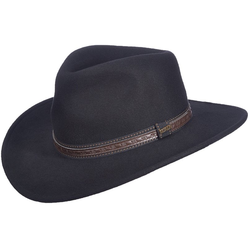 Stay comfortable and stylish in the heat when you wear the Scala Men's San Antonio Scala Outback Wool Hat. The wool felt construction offers a soft feel and features a water repellent finish to help keep you dry. The ribbon band and leather overlay add style to your look, while the 3-inch brim provides custom sun protection and cooling shade. Scala Men's San Antonio Scala Outback Wool Hat Black, Medium - Men's Hunting/Fishing Headwear at Academy Sports