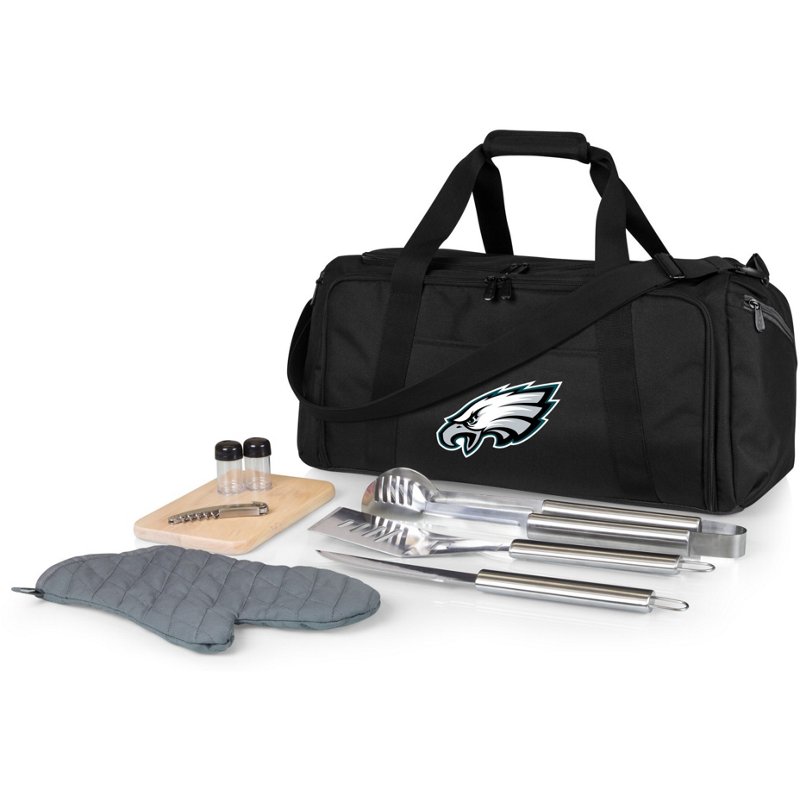 Show off your fan pride while grilling up your favorite food with the Picnic Time Philadelphia Eagles BBQ Grill Set and Cooler Kit. The cooler has a heat-sealed interior liner to keep food and drinks at the optimal temperature, and the included 8-piece stainless-steel grill set makes food preparation a breeze. The multiple pockets hold all your essentials, and the carry handles and shoulder strap promote simple transport. Picnic Time Philadelphia Eagles BBQ Grill Set and Cooler Kit - Pro Licensed Novelty at Academy Sports