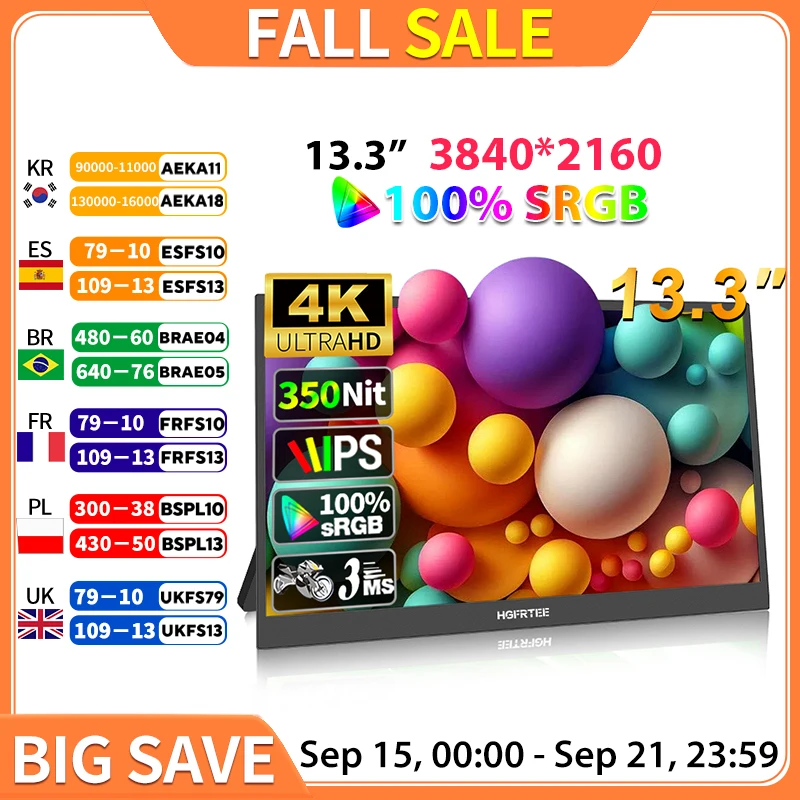 HGFRTEE 3840*2160 13.3inch 4K Portable Monitor 100%sRGB 350Cd/m² Second Screen for MAC/Laptop/PC/Xb…