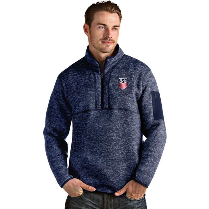 Layer up with the Antigua Men's USA Fortune Pullover Sweatshirt. The brushed back polyester heather fabric provides a comfortable feel, while the Antigua logo patch delivers a stylish look. Antigua Men's USA Fortune Pullover Sweatshirt Navy Blue, Small - International Soccer Events at Academy Sports
