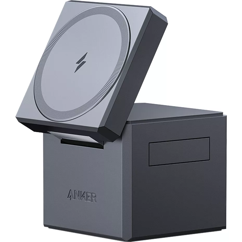 Keep all your Apple devices fully charged with the Magnetic Wireless Charger (3-in-1 Cube) with MagSafe. Made for MagSafe, this compact charging cube transforms into a 3-in-1 charging station for your iPhone, Apple Watch and AirPods. The cube wirelessly charges your devices with up to 15W of charging power. Charge in portrait or landscape mode so you can stream and use your phone while it charges. And, the ultra-lightweight design is made to be portable for all your on-the-go charging needs. | Anker Magnetic Wireless Charger (3-in-1 Cube) with MagSafe - Gray | Verizon