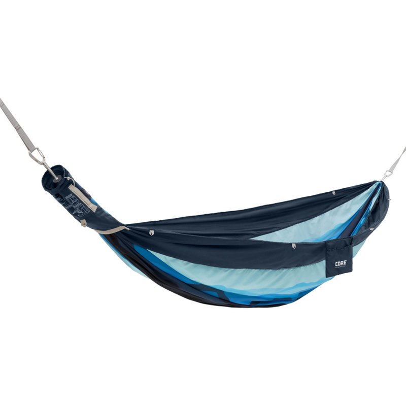 Kick back and relax on the CORE Equipment Double Hammock. The diamond ripstop nylon construction delivers a soft feel and durability, while the 10-foot tree straps and carabiners provide quick and easy setup. The 19 loops on each tree strap make it easy to adjust the height, while 14 webbing loops and a built-in side pocket let you keep personal items handy. CORE Equipment Double Hammock Bright Blue - Camp Pads And Hammocks at Academy Sports