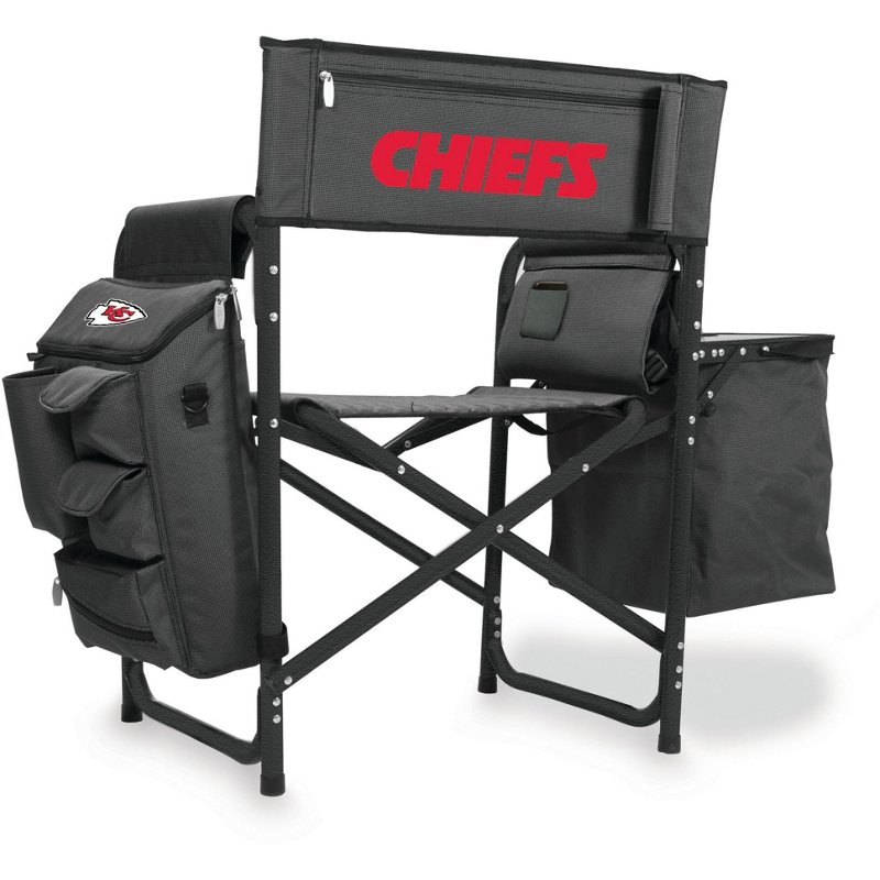 Show up prepared for your next tailgate with the Picnic Time Kansas City Chiefs All-in-One Fusion Camping Chair. Its padded seat and backrest keep you comfortable and are emblazoned with your team's logo. The cell phone pocket and accordion shelves offer ample storage for all your game day gear, and the folding side tray with cupholder lets you snack and sip with ease. When the party's over, the folding design and padded backpack straps enable convenient carry. Picnic Time Kansas City Chiefs All-in-One Fusion Camping Chair Dark Grey/Black - Pro Licensed Novelty at Academy Sports