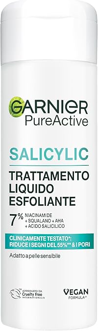 Trattamento liquido esfoliante per uso quotidiano, Riduce la visibilità delle irregolarità della pelle, Si assorbe velocemente e non appiccica, Adatto a tutti i tipi di pelle, anche alle sensibili Pelle liscia e levigata, Cicatrici e segni post acneici visibilmente ridotti, Pelle liscia senza effetto lucido, Visibilità dei pori migliorata per un effetto levigato Applicare su viso deterso e asciutto e prima del siero, Applicare sul viso utilizzando un dischetto di cotone o direttamente con le mani, massaggiare per un miglior assorbimento Formula arricchita da Salicylic Complex: Niacinamide, Squalano, AHA e acido salicilico per aiutare a purificare la pelle, Formula vegana dermatologicamente testata, Si assorbe velocemente Contenuto: 1x Garnier Trattamento Liquido Esfoliante, Pelle Liscia e Levigata, Pori e Segni Post Acneici Ridotti, Arricchito con Acido Salicilico, Niacinamide, Squalano, AHA, Pure Active, 120 ml
