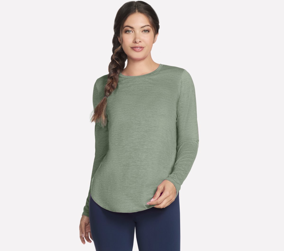 Keep your body warm while staying dry and comfortable wearing Skechers GO DRI® Swift Long Sleeve Tunic Crew. This long sleeve heathered tee is made from our UPF 40 GO DRI® SWIFT fabric and features a crew neck and high-low shirt tail hem. | Skechers GO DRI Swift Long Sleeve Tunika-Top Crew in Grau/Grün, Größe Groß